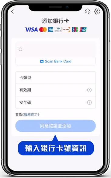 3.接著輸入本人銀行卡號(支援 Visa、MasterCard 等國際卡)
